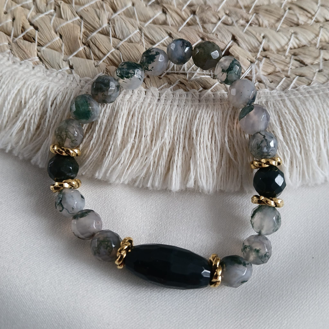 Dames armband Mosagaat met goudkleurige RVS – elastisch (1.310)