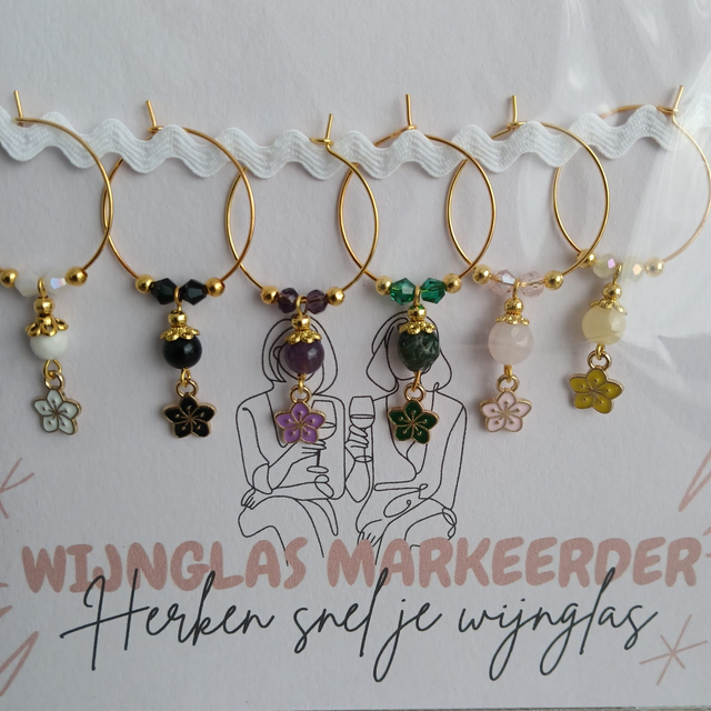 Wijnglas Markeerders (set van 6) met Glassteentjes en Edelsteenhanger met bloembedel (13.006)